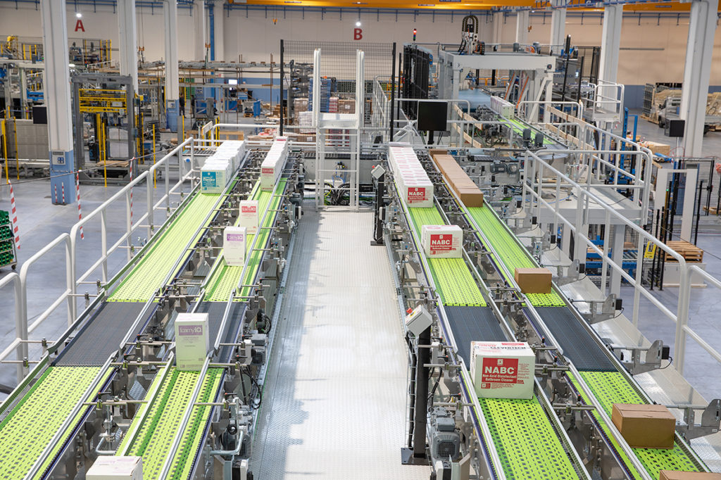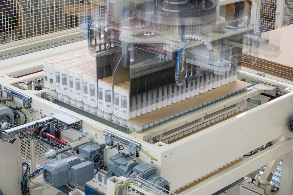Dank dieser Technologie ist die Produktionsanlage in der Lage, bis zu 125 verschiedene Bestandseinheiten auf derselben Palette zu palettieren, wobei ein vorgelagerter Produktsequenzer in das Gesamtkonzept integriert ist.
