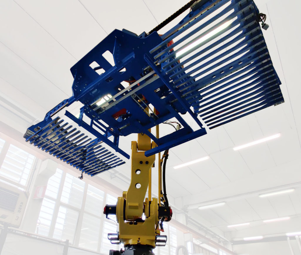 Das erste Projekt betrifft ein Roboter-Depalettierungssystem. Der von Clevertech entwickelte Tragetaschen-Depalettierer besteht aus einem innovativen Schichtenaufnahmesystem, mit dem man verschiedene Arten von Tragetaschen (konisch oder quadratisch) verwalten und bei jedem Zyklus volle Schichten von Tragetaschen entnehmen kann. Somit erzielt man höhere Geschwindigkeiten bei gleichzeitig geringerem Platzbedarf.
