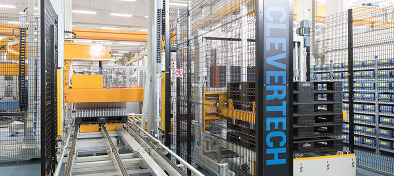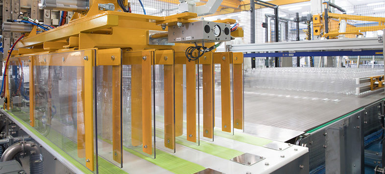 Das Clevertech-Team hat sich für die Lösung eines Palettiersystems entschieden mit nur einer Säule und einem Klappen-Greif-System, das die Leerflaschenreihen vom Flaschenhals nehmen kann. Dieses System ist sehr flexibel, weil die Funktionsfähigkeit nicht von der Flaschenform abhängt.