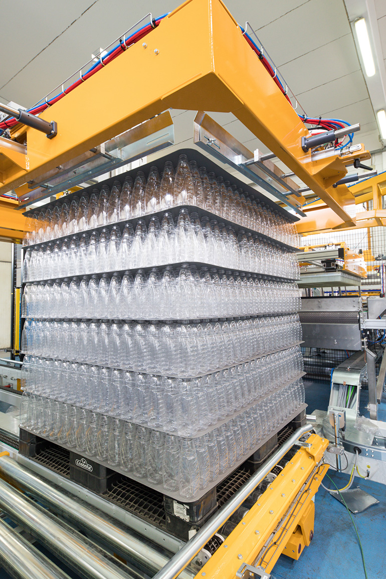 Zweitens hat die PET-Flasche eine sehr kleine Stellfläche und ist deshalb instabil und schwer zu palettieren. Man musste für ein instabiles Produkt eine geeignete Palettier-Technologie einsetzen.