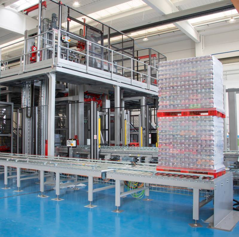 Entwicklung eines Depalettiersystems für Dosen aus Verbundmaterialien, ergänzt durch einen Hochgeschwindigkeitspalettiererfür Trays und Trays mit Gebindensowie eine Endverpackungslösung einschließlich Palettenwicklung, -etikettierung und -stapelung.