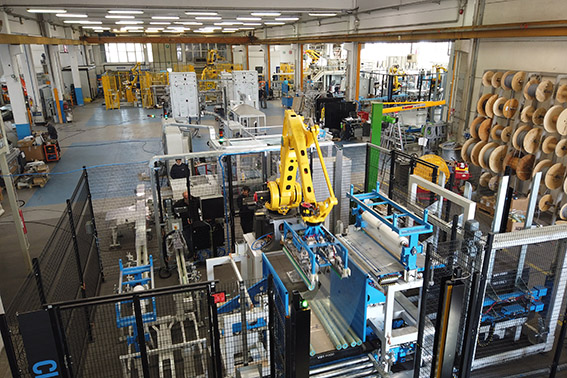 Die gleiche Ausrüstung wurde im Snake Palletizer, dem vollautomatischen Palettierer, der die robotische Technologie von Fanuc nutzt, installiert. Das System wird abgeschlossen mit einem Leerpaletten-Depot, einem Palettenentladesystem und einem automatischen Palettenbeladesystem.