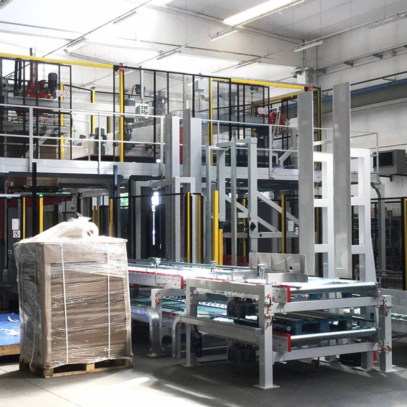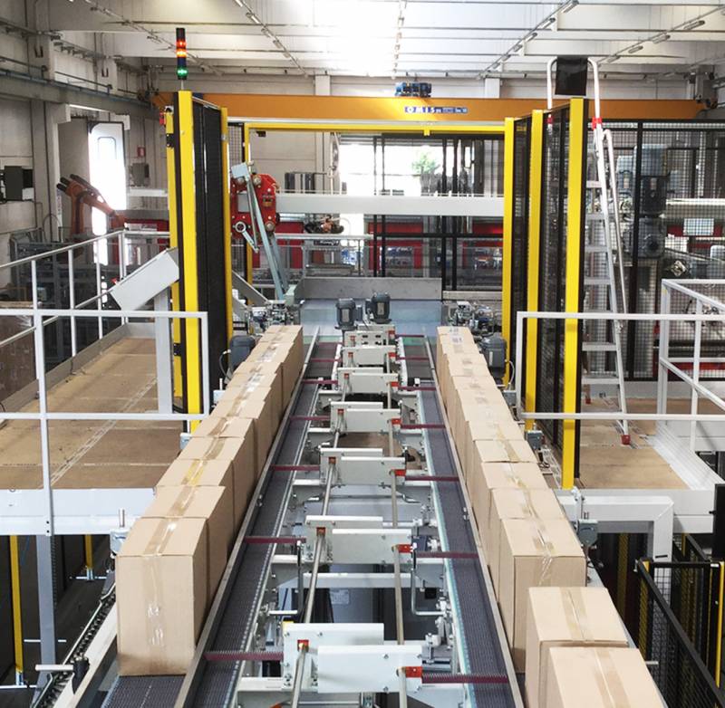 Schaffung eines speziellen, innovativen Software-Systems– Dinamic Flow Balancer – das die direkte Anbindung der beiden Kartoniermaschinen an den Palettierer ohne weitere Geräte ermöglicht: Der Palettierer reguliert jederzeit selbst den Produktfluss.