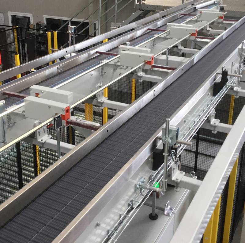 Die Schwierigkeit lag hier beim Ausgleich des Produktflusses von zwei parallel arbeitenden Kartoniermaschinen, ohne den Produktfluss in einen einzigen Zufuhrförderer für den Palettierer münden lassen zu müssen.