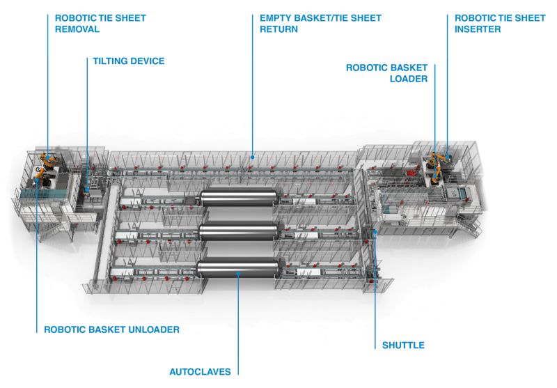 All consumables, such as interlayers, baskets, or trays, are automatically placed in recirculation loops by robots, which can extract and replace several items in different phases.