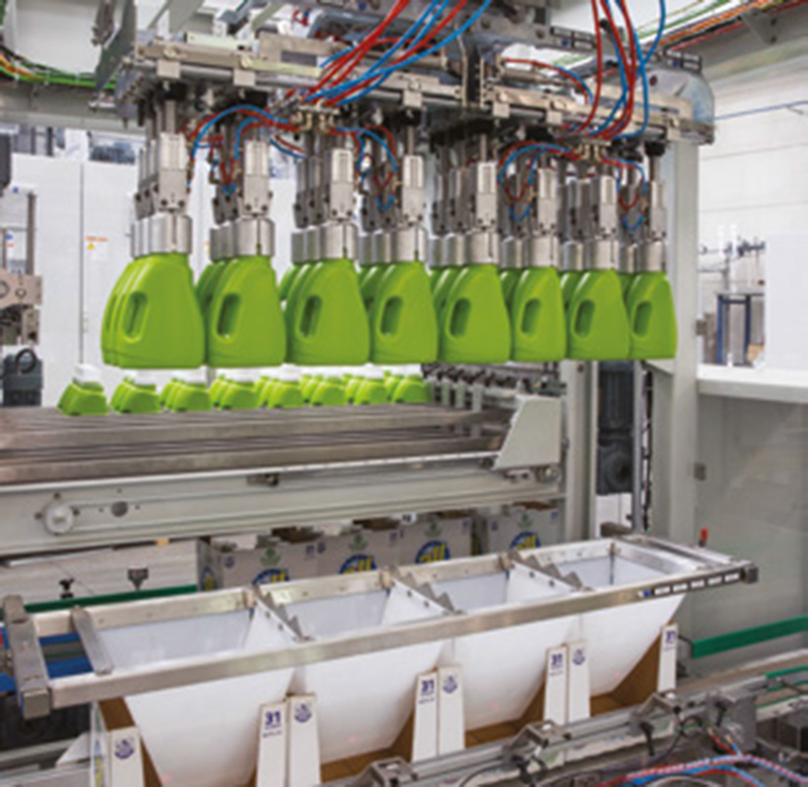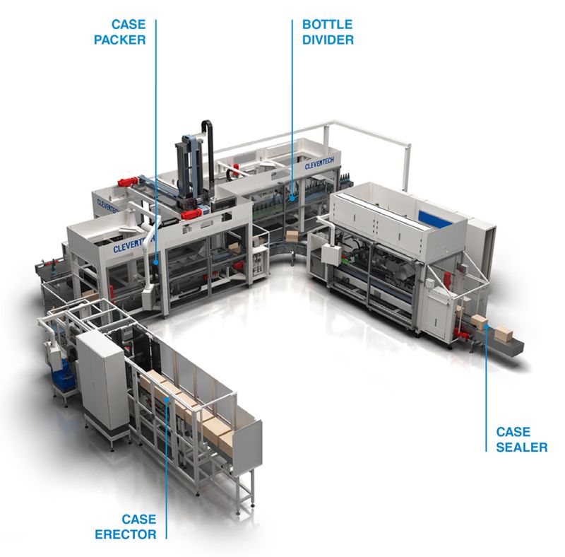 Clevertech secondary packaging equipment consists of a vertical pick & place packer designed to handle glass or plastic bottles, jerrycans, cans or small cases to be packed in a secondary carton.