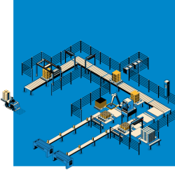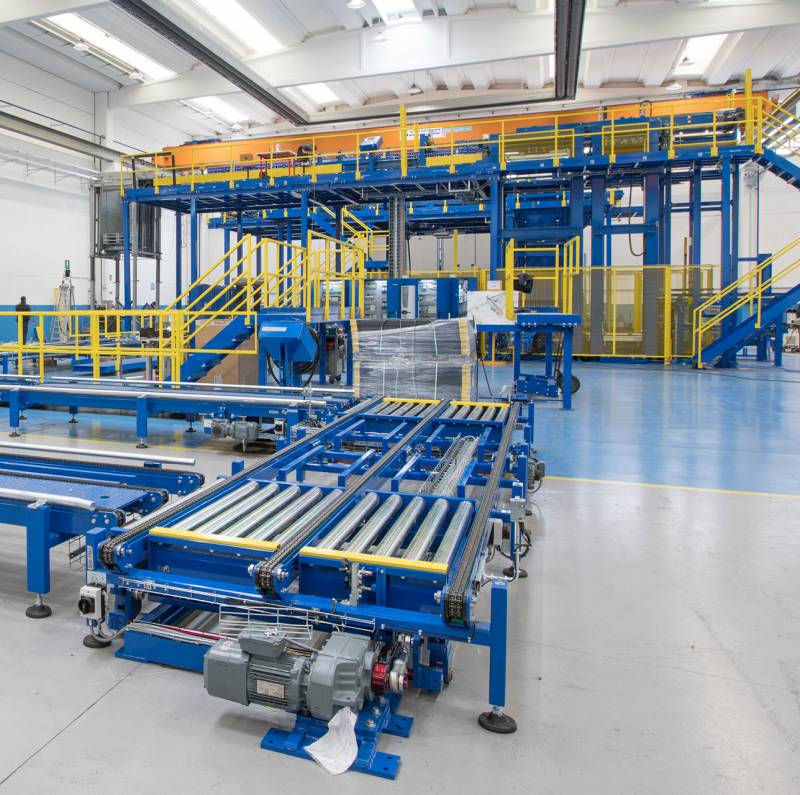 to create a high-speed bulk palletizing system for empty aluminium bottles, as well as a super sorting system composed of a depalletising system, inspection line and palletiser for empty bottles. Specifically, the challenge was reaching the required speed of almost 1800 bottles per minute as well as the highly unstable product in question. It was also necessary to create a system which is able to create complete layers of products without voids, and so a void reduction system was implemented. The customer also required the layer pads and empty pallets to be loaded from the ground, in order to facilitate the work of the forklift operators.