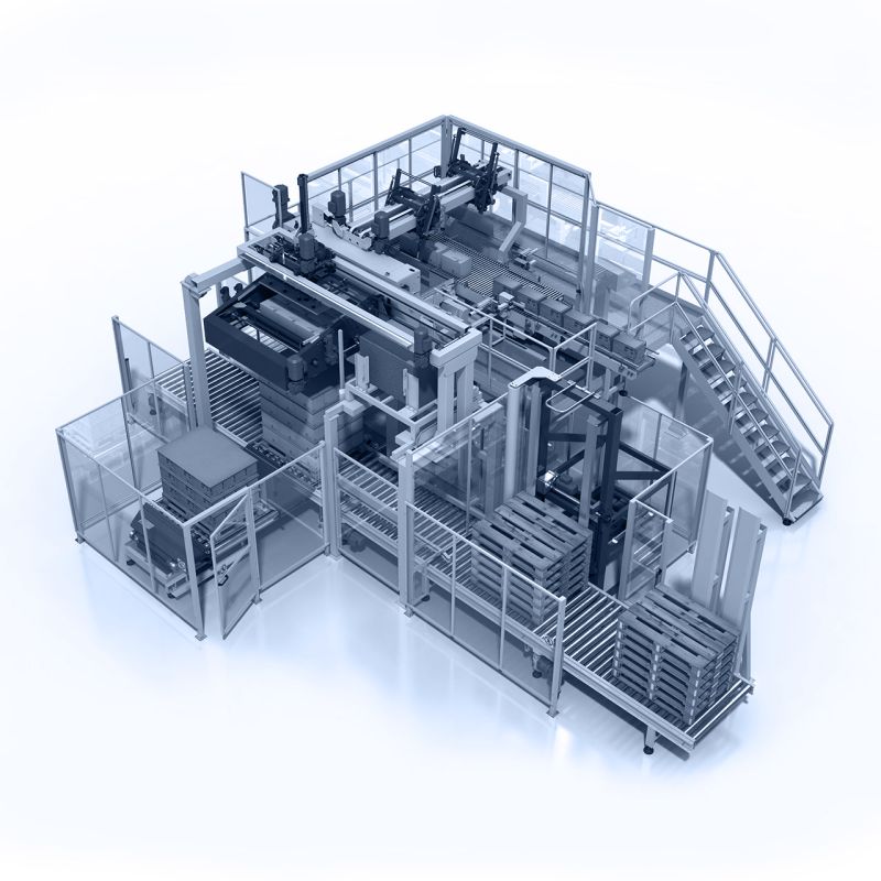 La serie AC 422/ 423/ 424/ 425 MULTI si costituisce di palettizzatori automatici a paletta fissa, trasferimento strato a 90° e con trasporti di alimentazione in quota. L’impianto può essere fornito nelle versioni a singolo (HS 1), a doppio (HS 2) o triplo ingresso (HS 3) e con sistema di formazione strato a singolo spintore (HS) o doppio (HSD), a blocchi (BLOCKS) o con manipolatori (robotici) (M 1 M 2). Quest’applicazione è ideale per la pallettizzazione simultanea di cartoni e fardelli su palette distinte (fino a cinque diversi prodotti) per una produzione a medie velocità. Massima flessibilità nella pallettizzazione fino a cinque tipi di prodotti diversi pur mantenendo elevate prestazioni di velocità.
