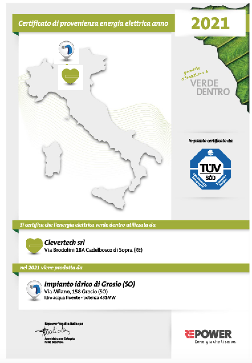 Firma demonstruje swoją dbałość o środowisko, opierając się na Repower, firmie posiadającej certyfikat TUV SUD Standard CMS. W roku 2021 Clevertech korzystał z całkowicie ekologicznej energii elektrycznej, pochodzącej z sieci wodociągowej Grosio (SO).